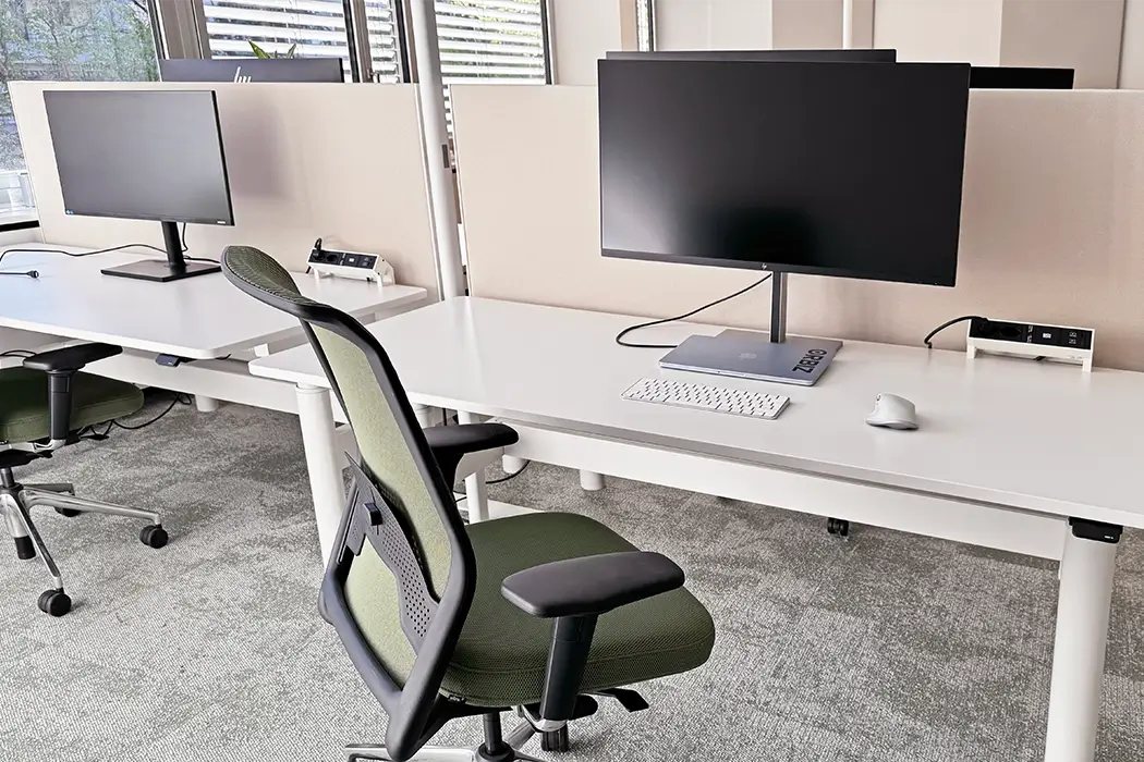 Es erwartet dich ein perfekt eingerichteter Arbeitsplatz mit höhenverstellbaren Desks, ergonomischen Bürostühlen und gutem Licht.